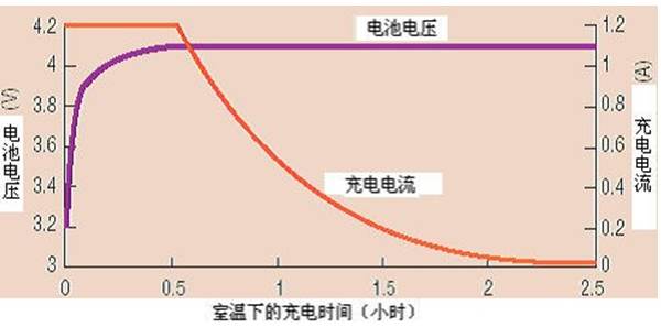 鋰離子電池的充電過程分為兩個階段:恒流快充和恒壓電流遞減階段。恒流快充階段,電池電壓逐步升高到電池的標準電壓,隨后在控制芯片下轉入恒壓階段,電壓不再升高以確保不會過充,電流則隨著電池電量的上升逐步減弱到零,而最終完成充電。由此可見,當充電指示燈轉換為“充滿”狀態(tài)時,實際充電電路依然在對電池做小電流充電,直至電池完全充滿、電流為零為止。如下圖所示,典型鋰離子電池充電曲線圖。黃色曲線為整個電池充電周期中,電池的充電電流值的變化,以右側的縱軸標注的電流值為參考;紫色曲線為電池(電芯)電壓的變化曲線圖,以左側的縱軸標注的電壓值為參考。