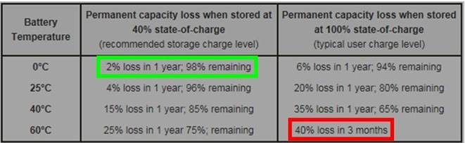如下實驗數據表明,電池溫度較低的環(huán)境下、且維持 40%左右的電池電量的條件下,1 年內電池容量的損耗非常有限。反之,如果電池在