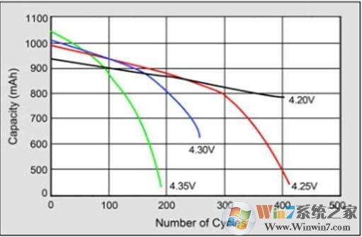 3)電池(電芯)充電電流、電壓不可過高。通過以下實驗數據曲線表明,電池電芯的電壓在 4.2V 可實現的充電次數明顯的比 4.35V 的條件下要高;電芯在長期過壓或欠壓的條件下,電芯化學活性的將發(fā)生急劇變化。這也從另外一個角度說明電池電量一直維持 100%電量時,對電池壽命的負面影響。