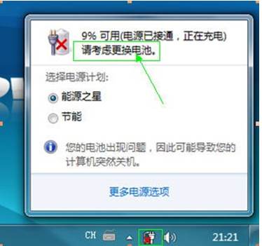 在微軟 Window 7 操作系統下,任務欄出現“紅叉”電源圖標,點擊后出現“請考慮更換電池”提示信息情形。典型參考視圖如下: