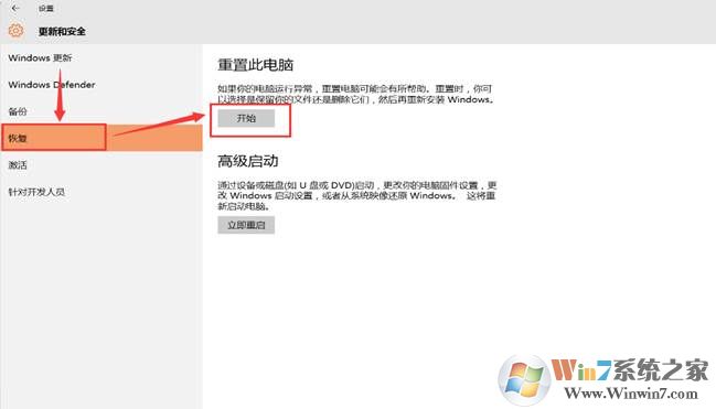 3、在左側欄中選擇 【恢復】選擇恢復,右側點擊重置此電腦 【開始】;