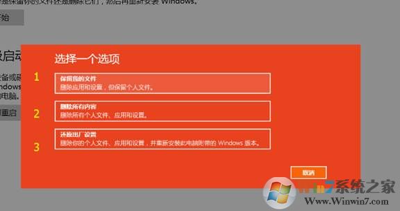 4、有三個選擇可以選擇,保留我的文件、刪除所有內(nèi)容、還有恢復出廠設置(小編建議恢復出廠設置,這樣可以恢復到買電腦時一樣的狀態(tài))