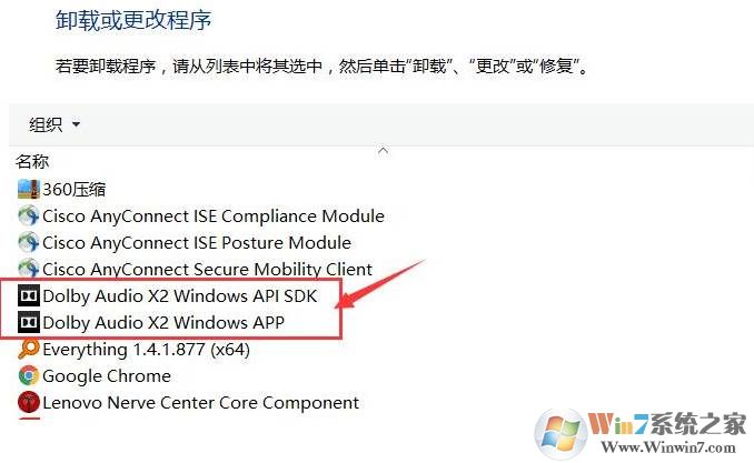 打開控制面板-卸載程序-觀察程序列表中是否有DOLBY Audio X2 Windows API SDK 和 DOLBY Audio X2 Windows APP 2個程序。