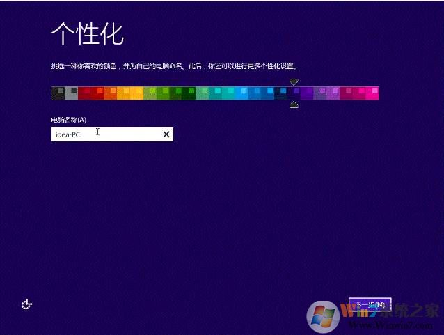 1、首先出現(xiàn)在大家眼前的第一項(xiàng)設(shè)置是個(gè)性化,需要選項(xiàng)一個(gè)主題顏色和電腦名稱,這里大家隨便選顏色或是不選也可以,輸入一個(gè)電腦名稱如 Winwin7,然后下一步;