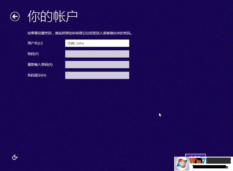 6、這時(shí)創(chuàng)建的就是本地帳戶了,輸入一個(gè)你的帳戶名稱吧,推薦不要使用中文。用全英文或是拼音的。