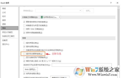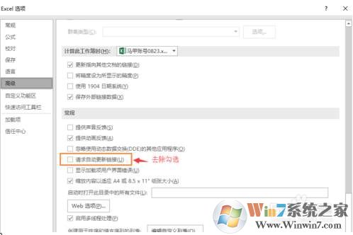 4、點(diǎn)擊“選項(xiàng)-高級(jí)”,然后把“自動(dòng)更新鏈接”勾選去除