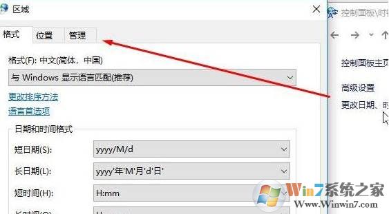 4、點擊左側(cè)的【更改日期、時間和數(shù)字格式】,在彈出的區(qū)域界面點擊【管理】;