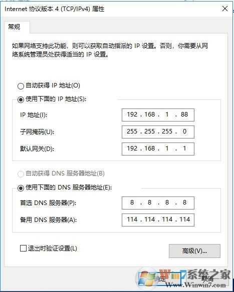 5、然后選擇使用下面的IP地址,默認網(wǎng)關(guān)填路由器IP地址,以太網(wǎng)IP需要和網(wǎng)關(guān)在同一網(wǎng)段,DNS可以選擇常用的。如8.8.8.8(谷歌) 114.114.114.114(國內(nèi)移動、電信和聯(lián)通通用的DNS)