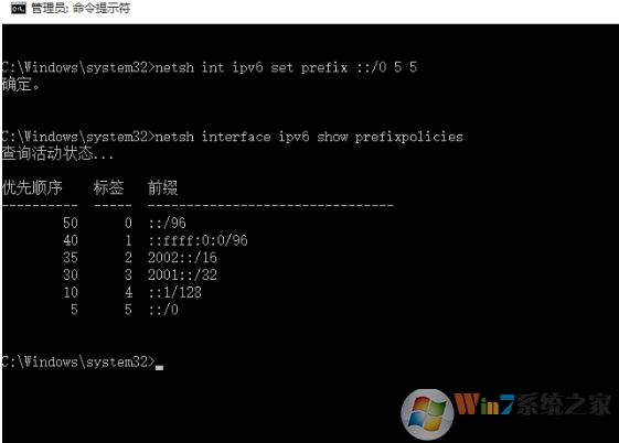 4、完了后輸入命令netsh interface ipv6 show prefixpolicies查看優(yōu)先級(jí):winwin7.com