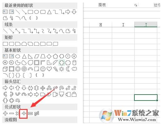 2、點(diǎn)擊形狀選項(xiàng)在其內(nèi)找到你想要加入的形狀,本教程經(jīng)公式形狀除號(hào)為例,如圖所示: