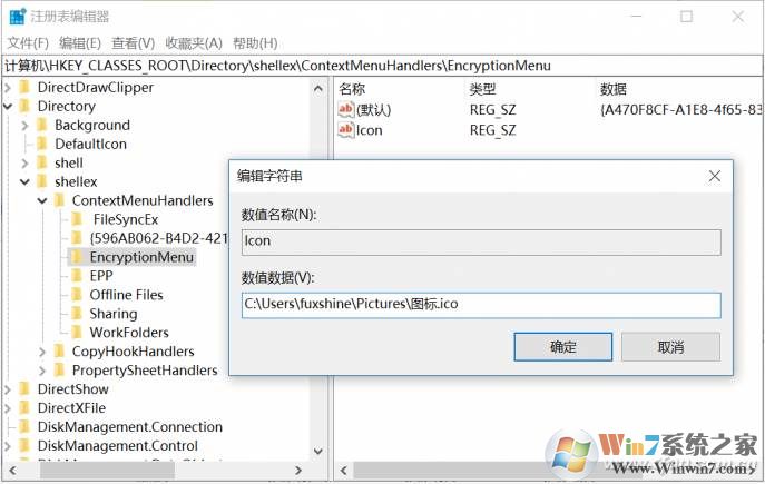 3、在左側找到“EncryptionMenu”項,在它的右側新建名為“Icon”的字符串值,數值數據呢,就填入大家存放圖標的具體路徑,并將圖標文件的名稱和擴展名都寫上。
