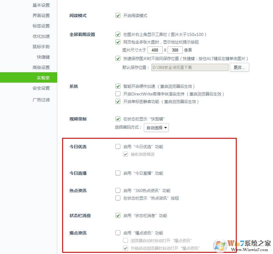 2、然后在左側(cè)選擇,實(shí)驗(yàn)室,右側(cè)中 把今日優(yōu)選、今日直播、熱點(diǎn)資訊、娛樂(lè)資訊等都取消勾選。