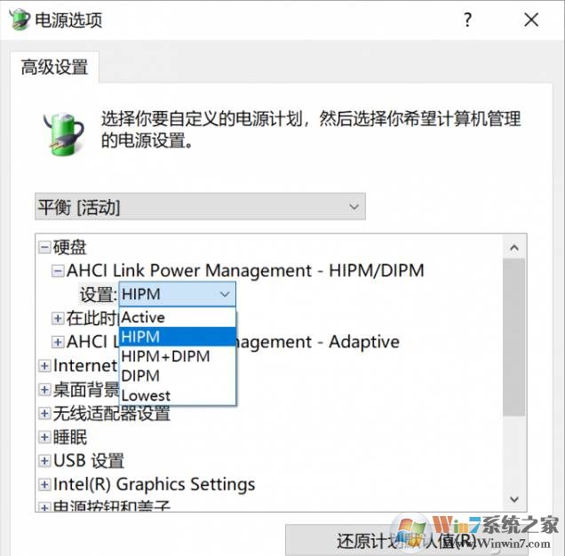 3、執(zhí)行完上面兩行命令之后,我們?cè)俅蜷_【高級(jí)電源管理選項(xiàng)】(依次進(jìn)入“控制面板-電源選項(xiàng)-更改計(jì)劃任務(wù)-更改高級(jí)電源設(shè)置),這時(shí)我們可以看到在高級(jí)設(shè)置【硬盤】下多了內(nèi)個(gè)選項(xiàng),其中AHIC Link Power Management-HIPM/DIPM是節(jié)能模式選擇,HIPM為主機(jī)控制、DIPM為設(shè)備控制,設(shè)置為Active會(huì)關(guān)閉節(jié)能模式,讓固態(tài)盤獲得最好的性能,Lowest則是最低功耗模式,性能有所降低。相信希望高性能的朋友知道怎么選擇羅。