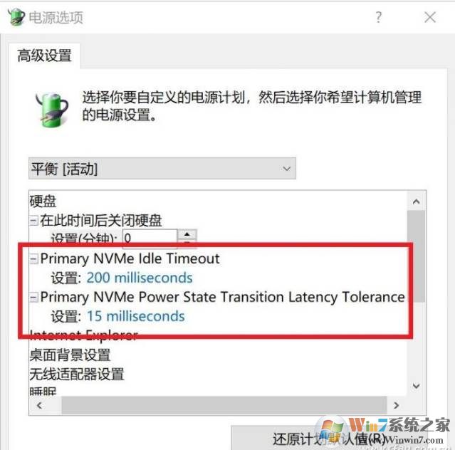 具體的效果和上面類似,這樣可以直接把Win10隱藏的相關(guān)電源選項(xiàng)顯現(xiàn)出來,其中 “Primary NVMe Idle Timeout”,是當(dāng)NVMe固態(tài)硬盤空閑超過多長時(shí)間之后,開啟節(jié)能模式。如果要更高性能就將這個(gè)值設(shè)置得大一些,比如500,追求節(jié)能就設(shè)置得小一些,比如100以下。