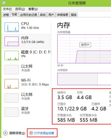 3、上面進(jìn)程列表顯示的內(nèi)存信息有限,要查看詳情,可以點(diǎn)擊"性能"標(biāo)簽頁,這個頁面會顯示內(nèi)存使用量的圖表,下方顯示內(nèi)存整體占用情況,使用中,可用,已提交,已緩存等信息,如圖: