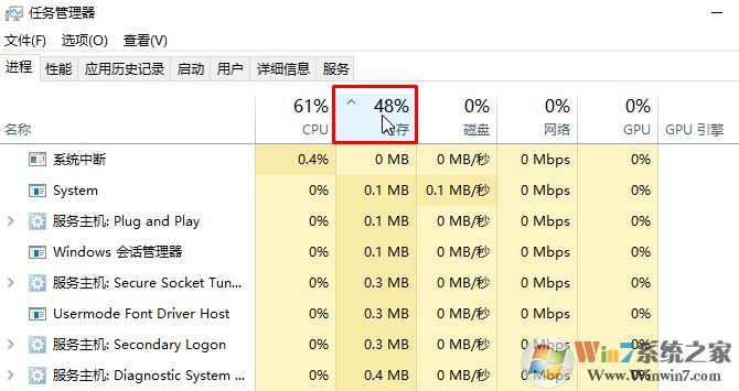2、打開任務(wù)管理器之后,我們在“進(jìn)程”選卡下可以看到很多選項(xiàng),在下面我們可以點(diǎn)擊【內(nèi)存】,此時我們系統(tǒng)中的所有進(jìn)程會按順序排序,點(diǎn)擊第一次的話會從高到低排序,點(diǎn)擊第二次的話則會按程序的內(nèi)存占用率從低到高排序;