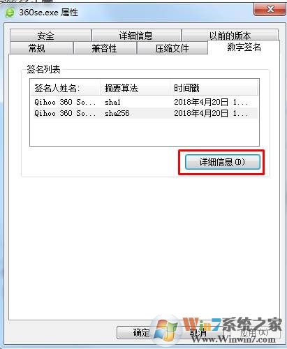 2、然后在數(shù)字簽名選項卡下就可以看到。接下來點擊“詳細信息”,(哦對了,小編只作演示,以下軟件小編還是要用的)
