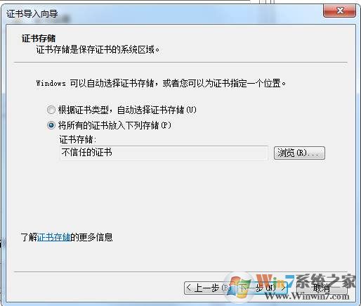 5、在接下來的窗口中,需要選擇“本地計算機”后下一步,瀏覽,并在彈出框中選擇“不信任的證書”。