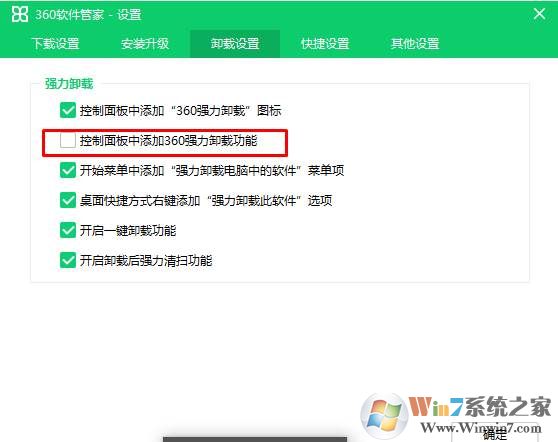 2、然后在卸載設(shè)置中,取消勾選 控制面板中添加360強(qiáng)力卸載功能;