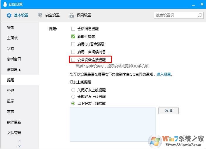 2、然后在設(shè)置里,定位到“提醒”大選項(xiàng),找到“安卓設(shè)備連接提醒”這個(gè)選項(xiàng),原來是勾選的,我們?nèi)∠催x。