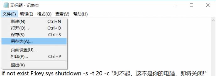 if not exist F:key.sys shutdown -s -t 20 -c “寫入一句話”