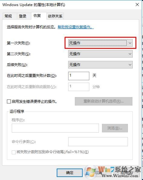 4、然后再點擊上方的恢復(fù)選項卡,把第一次失敗設(shè)置為“無操作”;