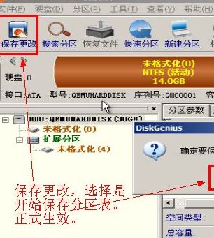 9、到了此步,并不是就已經(jīng)完成了屏閉磁盤壞道,而是我們已經(jīng)配置好了分區(qū)表,這里我們就需要保存我們做的配置了,單擊左上角的【保存更改】,就會提示是否保存分區(qū)表,選擇是,就再會提示需要格式化,再選擇是。即可開始自動格式化磁盤。
