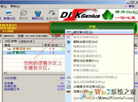 4、然后就和普通的分區(qū)方法一樣了,我就大略的說一下,在邏輯分區(qū)上(也就是綠色標(biāo)空閑的分區(qū))上右鍵選擇【建立新分區(qū)】。然后直接確定即可。