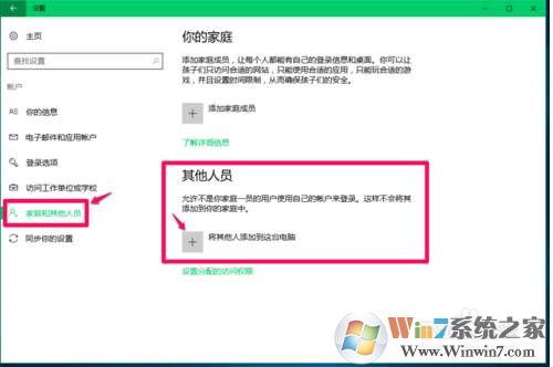 3、然后選擇家庭和其他人員,點(diǎn)擊將其他人添加到這臺(tái)電腦;