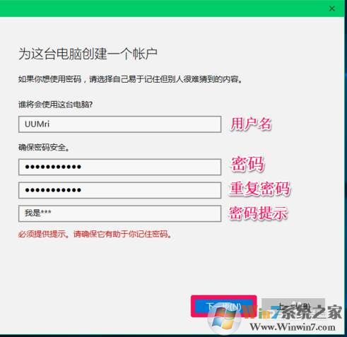 5、這里輸入用戶名、密碼,還有密碼提示;如不需要密碼留空即可。