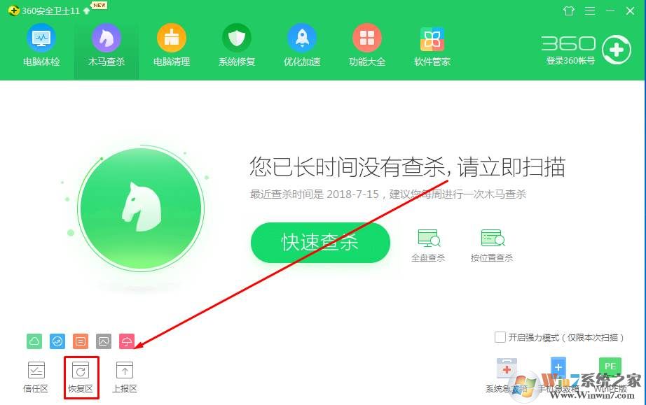 1、雙擊右下角圖標打開360安全衛(wèi)士主界面,然后選擇木馬查殺,然后點擊恢復區(qū);
