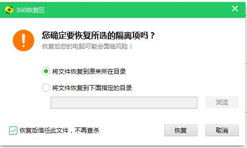 3、選擇一下將這個文件恢復到什么位置,默認恢復到原來的位置,然后勾選一下恢復后信任此文件,不再查殺,以免下次又給殺了。