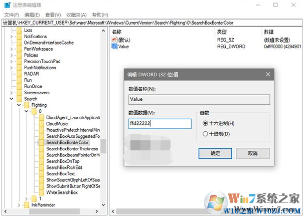 ② 把SearchBoxBorderColor的Value數(shù)值數(shù)據(jù)改為你希望的顏色代碼,比如“軟媒紅”為ffd22222,如下圖 ——
