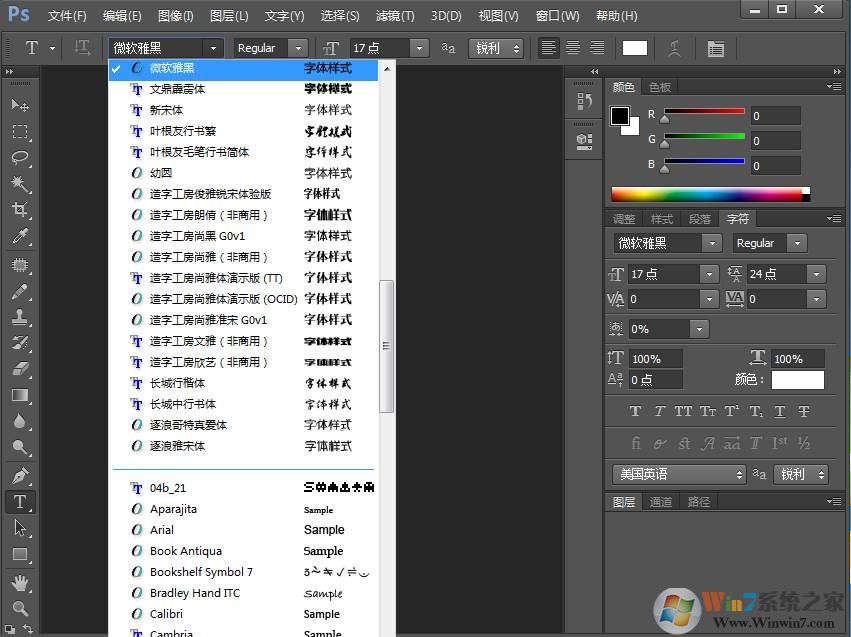 等到Win10字體安裝完畢之后,我們再打開PS軟件,就可以發(fā)現(xiàn)選擇文字工具之后就能看到新安裝的字體了。