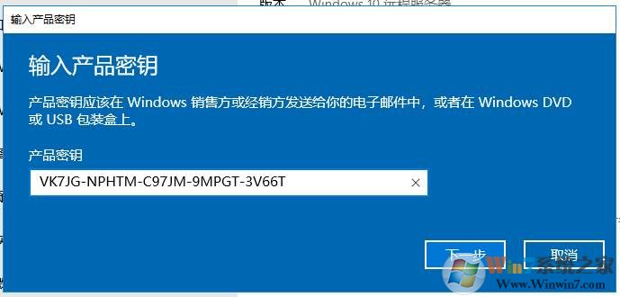 4、輸入:VK7JG-NPHTM-C97JM-9MPGT-3V66T 下一步;