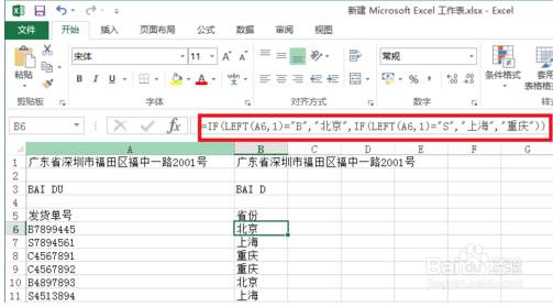=IF(LEFT(A6,1)="B","北京",IF(LEFT(A6,1)="S","上海","重慶"))