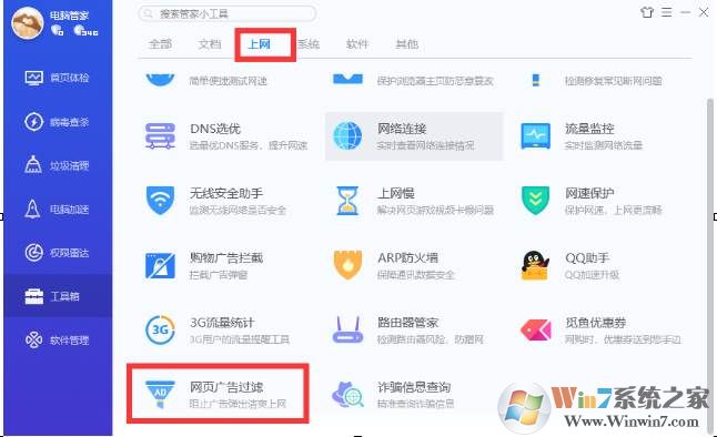2、然后在工具箱的【上網(wǎng)】里找到,網(wǎng)頁(yè)廣告過(guò)濾功能。