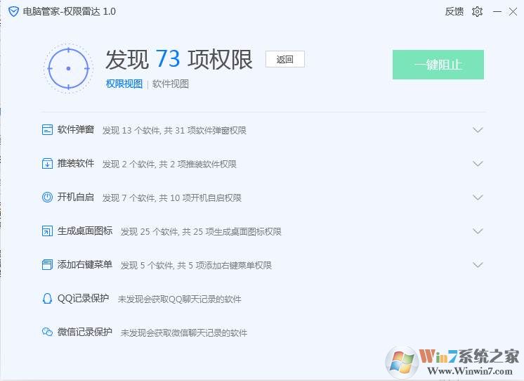 需要注意的是:權(quán)限雷達(dá)與彈窗攔截是有本質(zhì)區(qū)別的,彈窗攔截功能是單一的對(duì)軟件彈窗進(jìn)行攔截,而權(quán)限雷達(dá)功能,是整體掃描電腦中已安裝軟件且會(huì)在用戶不知情下所出現(xiàn)的一些行為,如:彈窗,自啟,推裝等,可統(tǒng)一掃描以后進(jìn)行管理。
