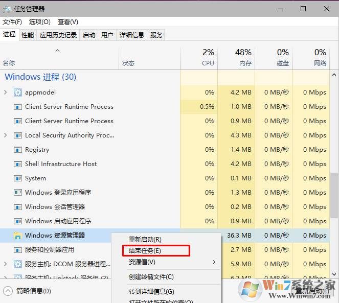 2、打開任務(wù)管理器之后,找到windows資源管理器,選中,右鍵結(jié)束任務(wù),如下圖;