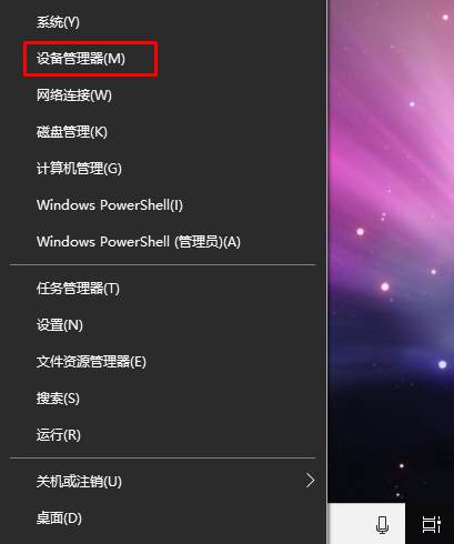 1、右鍵點擊開始菜單,打開設(shè)備管理器;