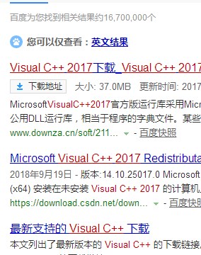 1、參考自己當(dāng)前所提示的c++版本號(hào)進(jìn)行搜索下載,如,小便這里提示的是c++2017 x64版本的,那么就去網(wǎng)上搜索該版本進(jìn)行安裝即可。