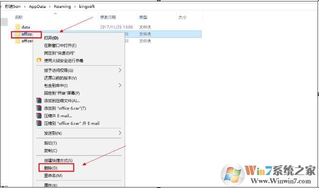 6、進入kingsoft文件夾后將其中一個office文件夾刪除;