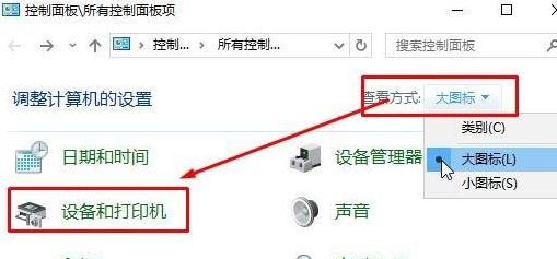 3、在控制面板右上角將查看方式修改為大圖標(biāo),在打開設(shè)備和打印機(jī);