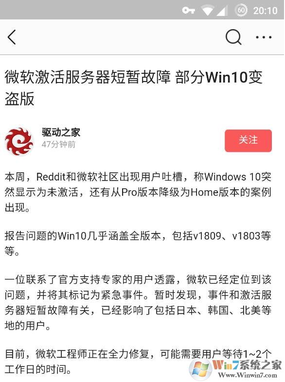 微軟表示該公司激活服務(wù)器目前出現(xiàn)異常導(dǎo)致用戶出現(xiàn)掉激活情況,系統(tǒng)會顯示未激活并無法聯(lián)網(wǎng)進(jìn)行激活。