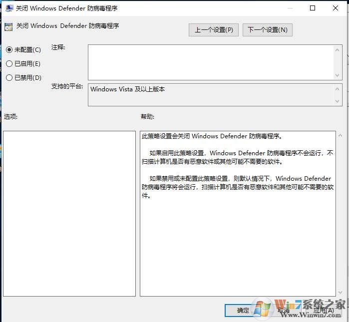 3、雙擊打開Windows Defender防病毒程序,然后設(shè)置為未配置或禁用即可。