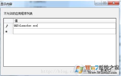 4、點擊顯示后,會彈出如下窗口,然后在“顯示內(nèi)容”窗口,添加要禁用的軟件名稱。,如我們要禁止QQ啟動,那么輸入QQ的啟動程序QQScLauncher.exe,確定即可。m.cncxm.com win7系統(tǒng)之家