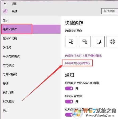 3、在Win10系統(tǒng)功能設(shè)置頁面中,點(diǎn)擊選擇“通知和操作”選項(xiàng),在該選項(xiàng)頁面右端點(diǎn)擊選擇“啟用或關(guān)閉系統(tǒng)圖標(biāo)”菜單選項(xiàng)。