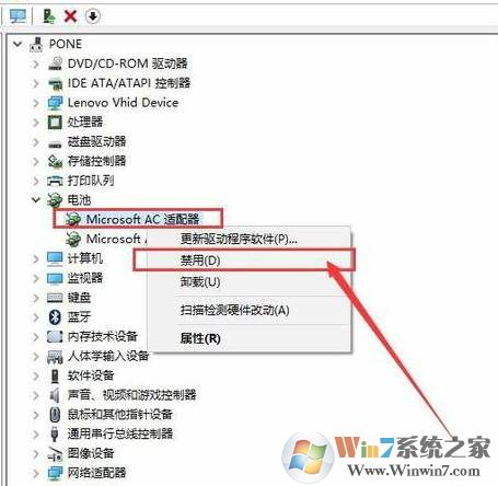 3、在設(shè)備管理器設(shè)備右側(cè)頁面中,雙擊打開電池設(shè)備項(xiàng)目,然后找到“Microsoft AC控制器”和“Microsoft ACPI兼容的控制方法電池”兩個子項(xiàng),依次點(diǎn)擊這兩個子項(xiàng),然后在彈出的右鍵菜單中選擇“禁用”選項(xiàng),這兩個子項(xiàng)均需要禁用。