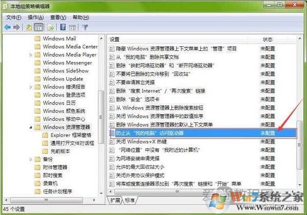 2、確定后彈出本地組策略編輯器,接著依次展開“用戶配置→管理模板→windows組件→windows資源管理器”再接著有右側(cè)找到“防止從我的電腦訪問驅(qū)動(dòng)器”,雙擊打開。如圖: