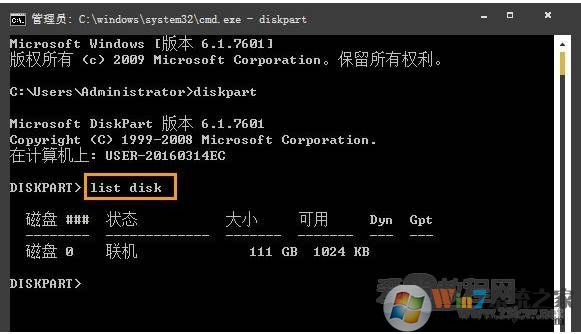 3、接著寫入并執(zhí)行l(wèi)ist disk,也就是把電腦上的所有硬盤都羅列出來,圖中只有一個硬盤,只顯示磁盤0;